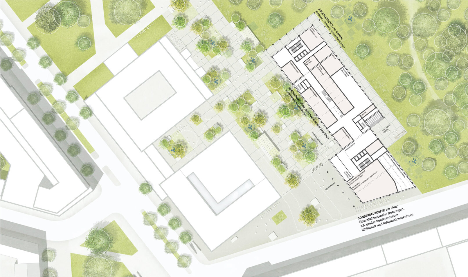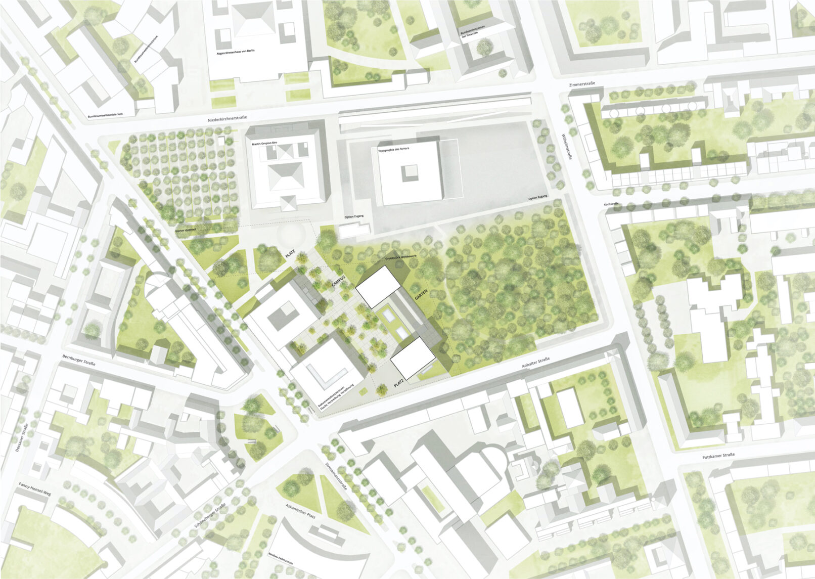 Der neu entstehende Campusraum mit klar ablesbarer Freiraumfigur, gefasst von den Raumkanten aus Bestand und Neubau, orientiert sich wie auch der Neubau in seiner Ausrichtung am bestehenden Ensemble aus Deutschland- und Europahaus und verbindet den dreieckigen neuen Eingangsvorplatz im Süden mit dem denkmalgeschützten Rondell vor dem Martin-Gropius-Bau im Norden in klar ablesbarer Linearität. Das neue Freiraumangebot des Campus als urbanes und repräsentatives Raumangebot wird durch einen auf der östlichen Seite angelegten, großzügigen und nahezu vollständig unversiegelten Ministeriumsgarten ergänzt. Die vorhandene Baumbepflanzung im Osten wird so sinnvoll mit dem Grundstück zusammengeführt und eine Positionierung des neuen Ministeriums zwischen einem offenen Campusplatz und einer grünen, parkähnlichen Freiraumstruktur ermöglicht. In dieser qualitätvollen Umgebung wird bewusst auf die Schaffung einer Innenhofsituation für den Neubau verzichtet: sämtliche Aufenthaltsräume erhalten dadurch attraktive Sichtbeziehungen in die umgebenden Stadt- und Grünräume. In der Komposition des Gebäudes aus Solitären und Verbindern entsteht dabei eine Analogie zum Bestandsensemble aus Deutschland- und Europahaus, das schon in der gegenwärtigen Situation mit verbundenen Solitären eine vielseitige und differenzierte stadträumliche Wirkung aufweist.