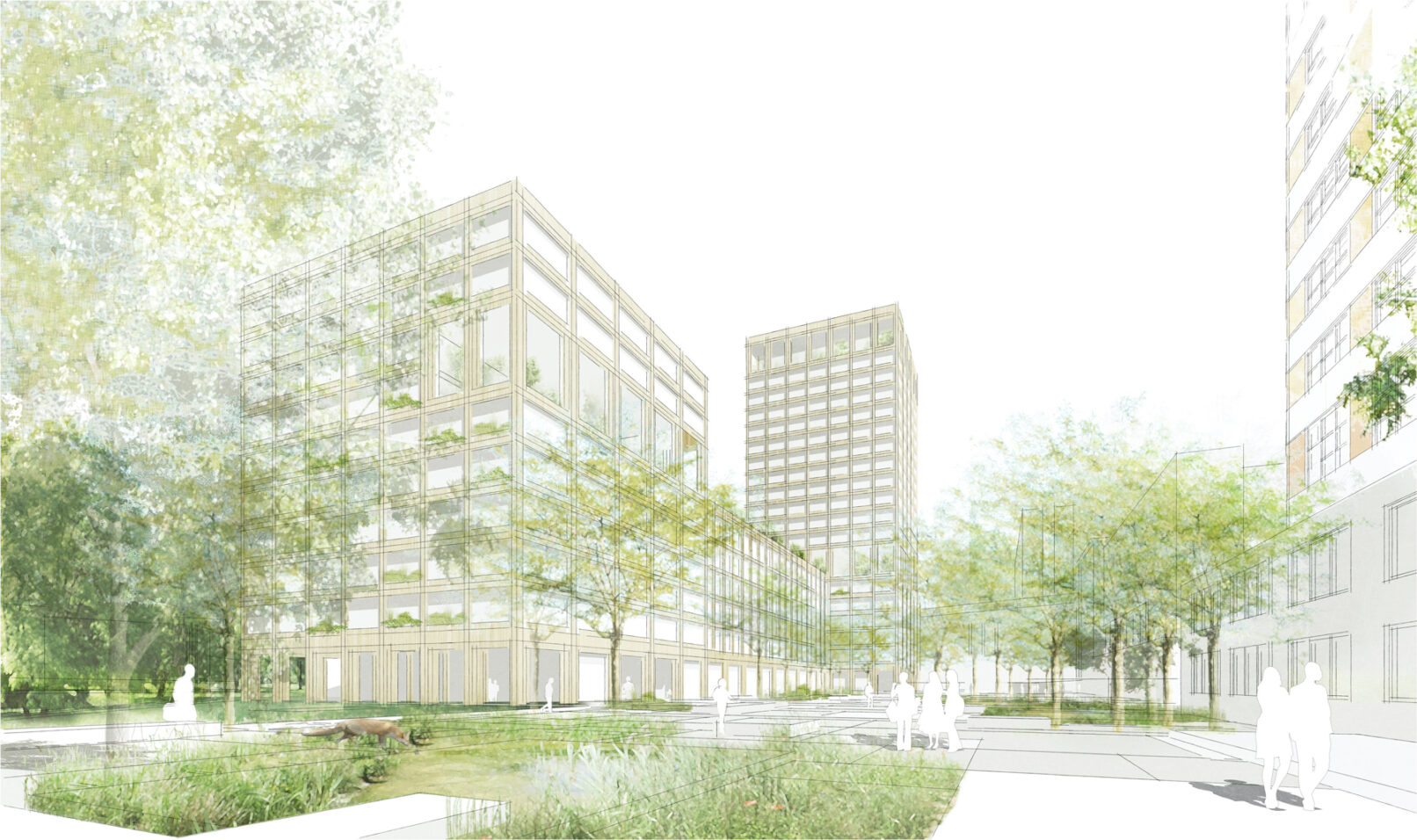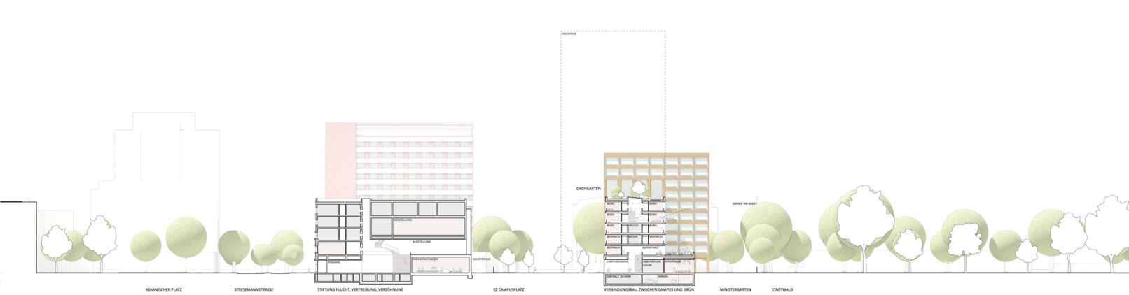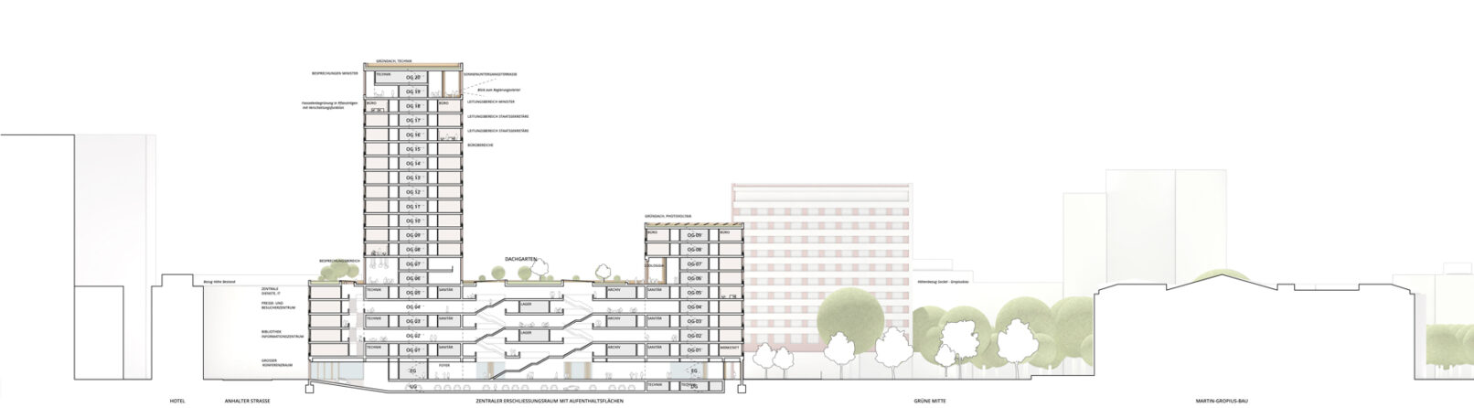 Der Entwurf beantwortet die komplexen Anforderungen in dem historisch bedeutsamen und vielschichtigen Areal mit einer klaren baukörperlichen Setzung, die den Anforderungen der stadträumlichen Ergänzung, Neuordnung und Vernetzung Rechnung trägt und ein Ensemble aus Bestand und Neubau, verbunden über einen Campusraum als freiräumliche Vernetzung, vorschlägt. In der Fortsetzung der Schöneberger Straße stellt ein 21-geschossiges Hochhaus dabei eine neue stadträumliche Dominante dar, die mit dem geplanten Hochhaus am Anhalter Bahnhof stadträumlich kommuniziert, den am neu entstehenden dreieckigen Platz vor dem Deutschlandhaus positionierten Haupteingang in das Ministerium markiert und Besucher:innen auf den verbindenden Campusraum zwischen Neubau und Bestandsgebäuden leitet.