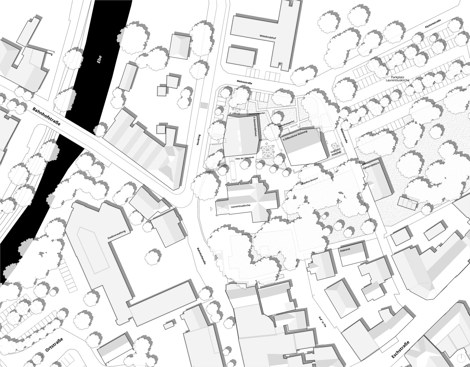 Der Entwurf schlägt für das vielschichtige, räumlich komplexe Grundstück an der Laurentiuskirche eine klare städtebauliche Setzung vor, die solitäre Baukörper im qualitativ hochwertigen Freiraum ausgewogen platziert, sich an die vorhandene Maßstäblichkeit anpasst, den Höhenunterschied zwischen Stadt und Kirchhof nutzt und mit Kirche und zukünftiger Stadtbibliothek ein spannungsvolles Ensemble bildet. Die Neubauten bilden im Ensemble mit Kirche und umgebenden Bau- und Freiraumstrukturen vielfältige Räume unterschiedlicher Prägung, Höhenlage und Ausrichtung. Den Freiräumen zugeordnet sind die Nutzungen auf zwei Ebenen organisiert: Gemeindebüro und stadtseitiger Zugang zum Nordring, der Jugendbereich mit Terrasse und Gartenorientierung, Nebenräume und WCs befinden sich auf der unteren Ebene. Der Saal mit Terrassenzugang und großzügigem Freiraumbezug, das Foyer/Café direkt gegenüber der Kirche und die zugehörige Küche sind auf der oberen Ebene des Kirchhofes geplant. Eine zentrale Erschließung mit Oberlicht verbindet beide Ebenen auf kurzem Weg und barrierefrei. Die Grundrissgestaltung ermöglicht vielfältige Nutzungsszenarien in der Zusammenschaltbarkeit von Gruppenräumen und Foyer, der Küche mit großzügiger Thekensituation zum Foyer aber auch direkter Anbindung zum Saal. Der Neubau für das Gemeindehaus bildet im direkten Gegenüber des Foyers mit großzügiger Eingangssituation zum barrierefreien Eingang ins Seitenschiff der Kirche eine räumliche Einheit. Hier entsteht der neue Platz der Gemeinde. Auf eine direkte bauliche Anbindung wird verzichtet, um die herausragende Wirkung der Kirche nicht zu stören, eine freistehende Überdachung der Verbindung könnte geprüft werden. Der Baukörper für die zukünftige Stadtbibliothek orientiert sich an den Richtungsbezügen von Gemeindebüro und Wehmstraße, wo auch der Haupteingang verortet wird. Bibliotheksgarten und Gemeinschaftsterrasse sind unmittelbar erreichbar.